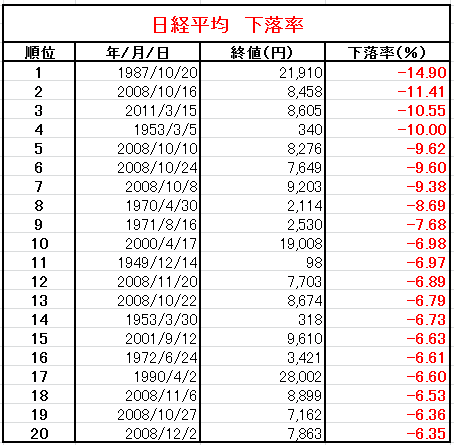 下落率、下落率とも1位はブラックマンデーの時でした。