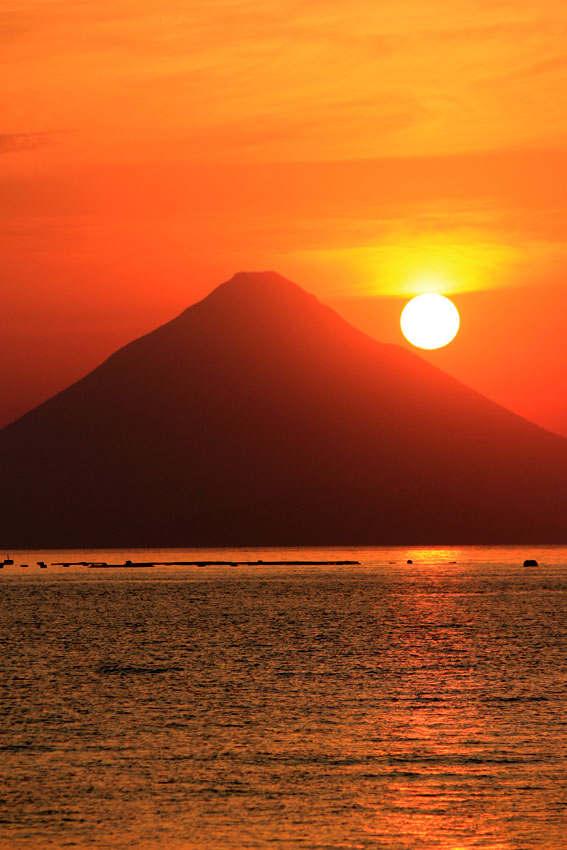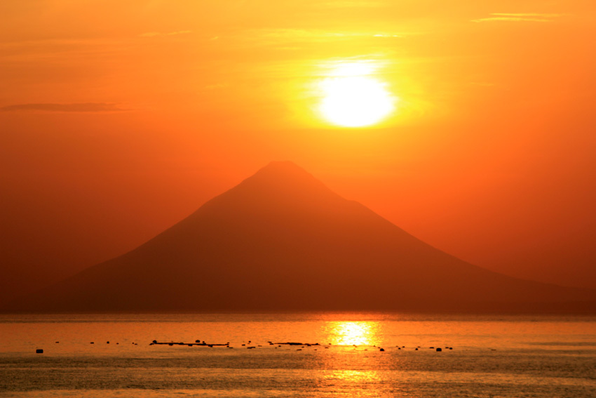 大泊を出て、海岸線へ出ると太陽が開聞岳に沈んでいくところでした。