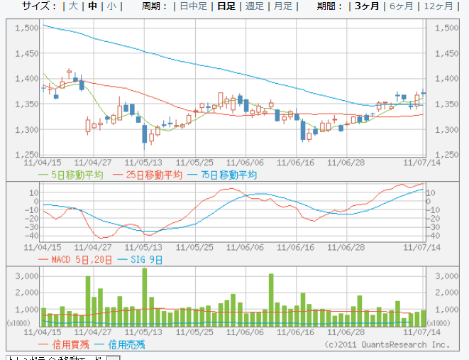 MACDも上昇を証明している。 が、これでは、上げ止まりそうに見えるし、5,6月の上げ下げの理由が見えないので、上値余地が分からないため買いと判断できない。