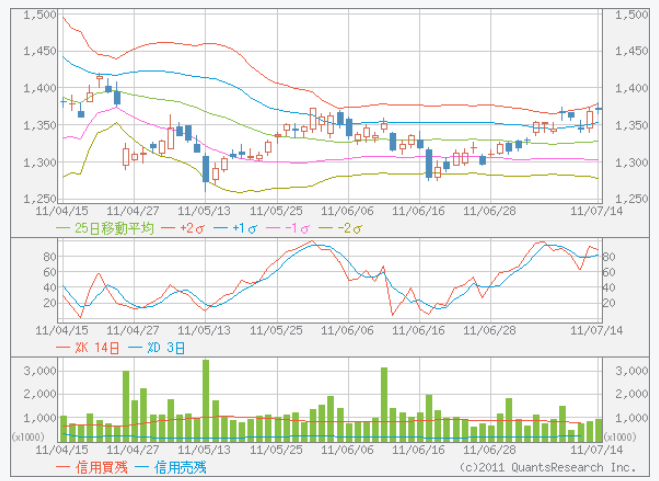 ローソク足に添えられた移動平均線では、5日線が切り上げて上昇を示唆。