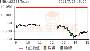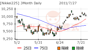 終値は9900円と、憶測どおりだが、9850円の安値を付けて、ボックスのレンジを下に広げている。アメリカの債権上限問題解決までは続落と言うことらしい。チャートでどこまで下げるかと言われると、難しい局面になったといえよう。