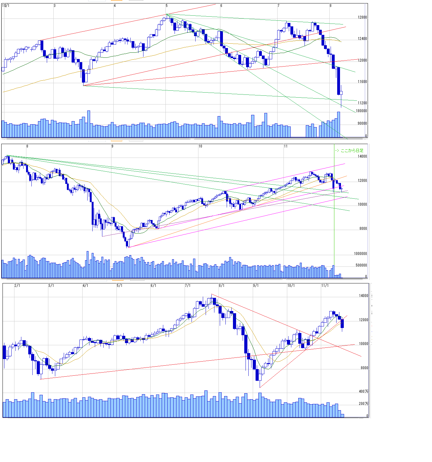 他にも24ヶ月線や100週線、200週線や週足雲下限など、10700~11000には一応抵抗線はあるので、ここらで反発できるか。