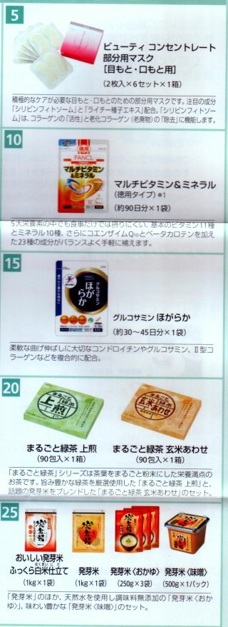 写真のカタログの25品目+社会福祉法人『訪問の家』(横浜市栄区)への寄付の計26品目の中から好きな組み合わせで4品目を選び、申し込み葉書を返送することで後日商品が送られてきます。