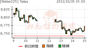 午前の8800円切り下げを確認していたが、8750円を安値に反騰したが、この頃から円安に向かっている。特に、ユーロドルが回復しているのが特徴的。何か好材料が出たと思われる。