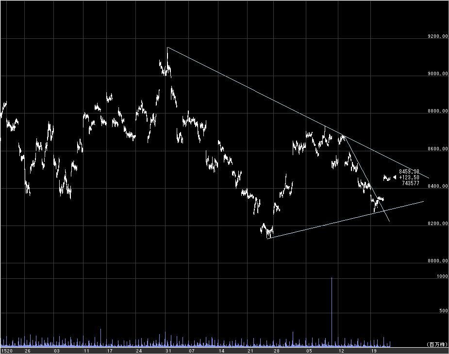 NYが強かったので上値抵抗線を抜けてブレイク。買い戻しました。しかし、判断が遅くて8460で;;