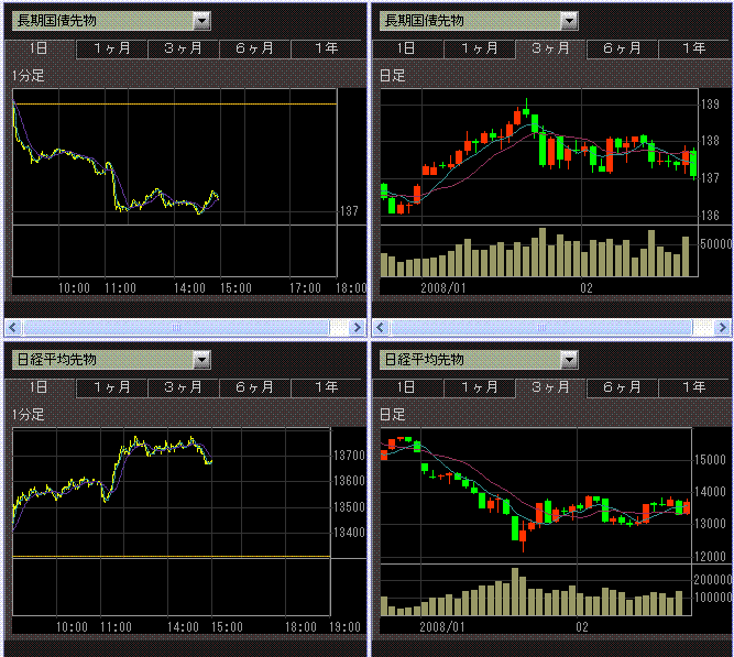 昨日株先物を売ったところの買戻しと、債券先物売り・株先物買いの動きですね。米長期国債が売られているので、日本の長期国債も売られやすいようです。アメリカも長期国債と株の動きが連動する傾向がありますが、日本の動きは異常だと思います。現物の商いが薄いから、先物の影響が非常に大きくなるのでしょう。しかし、カリヨンやクレディスイスからの先物手口は毎度同じようなパターンで、似たアルゴリズムで取引するヘッジファンドが多いんですかね。