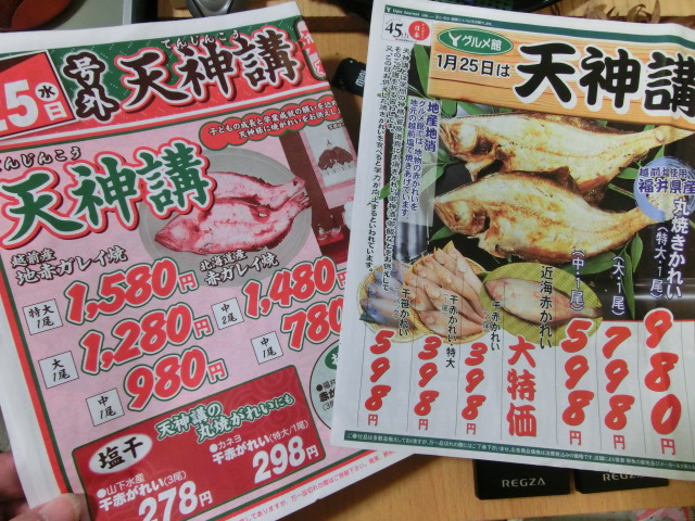 福井では焼きカレイをお供えして食べるのが天神様ということか、どこのスーパーも焼きカレイの特別ポスターと売り場ができてます・・・・・ →Orz///