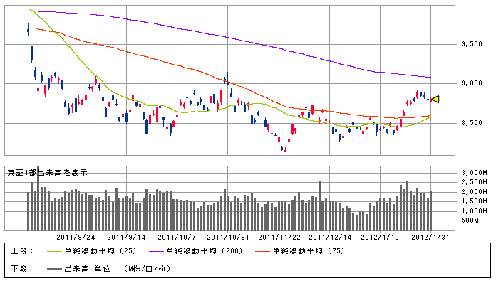 目安としては、日経¥8,600あたりに25日線と75日線があり、GC間近の様相を呈しているため、