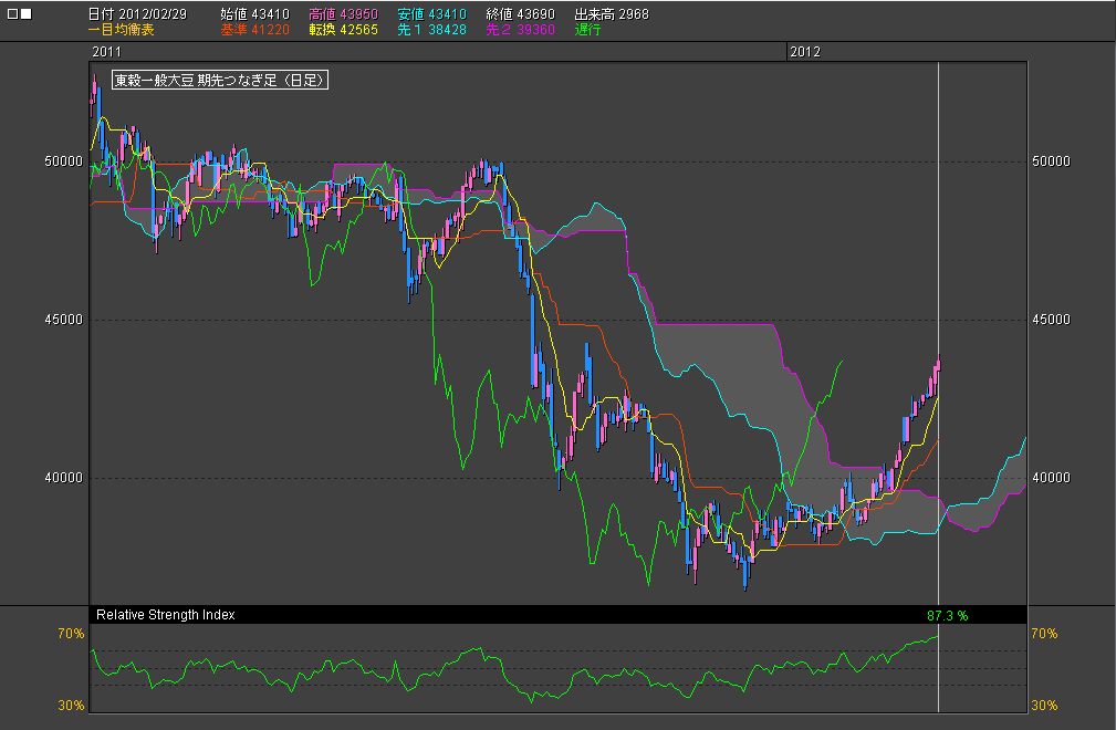 下記のチャートは東京一般大豆日足(一目均衡)である。昨年4月の高値52,780円から12月の安値36,410円までの下落幅16,370円これをフィボナッチで見ると、38.2%戻りで42,660円、50%で44,600円、61.8%だと46,530円となる。2月29日(15:30)現在43,690円(RSIは82%)であるが、早い段階で昨年10月の戻り高値44,250円、半値戻しの44,600円を取らないと、調整の可能性があるのでは?