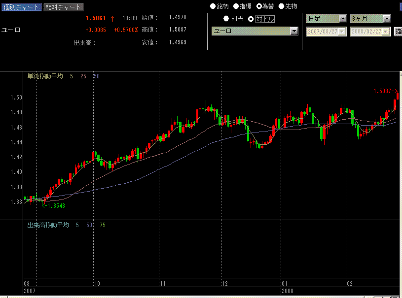 消費者信頼感指数は予想を下回る低水準(⇒個人消費減)、生産者物価指数は予想を上回る高水準(⇒インフレ懸念)と、経済指標はネガティブなものでしたが、IBMが自社株買いを発表し、大手企業は信用収縮にもかかわらずキャッシュリッチで体力があるとの見方が広がり、株価指数は大幅続伸。それと単純に、IBMは値嵩株なのでダウへの指数寄与度が大きいです(ダウは日経平均と同じ株価平均型の指数)。米経済指標からドルが売られ、ユーロは対ドルで最高値を更新。原油価格(WTI)は101ドルまで上昇。