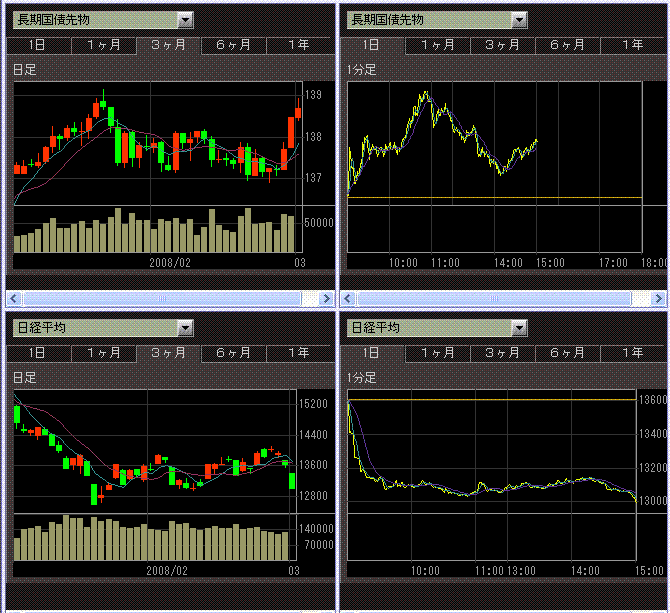 米株下落と円高ドル安進行を受けて大幅続落。1月2月に下値を買っていた国内機関も今は期末前で動きづらい時期なので、現物に買いが入りにくいと思われます。でも外国人の現物の売りも、1月下旬~2月上旬に比べると減っている感じ。そのため、大幅下落で日経平均13000円に接近しても現物出来高が増えてきません。3月後半になれば配当取りや貸し株返済の買戻しで株価は上がるかなと思うのですが、3月前半は前述のように現物の買いが薄そうなので先物主導での下方向へ動きに注意が必要かと。
