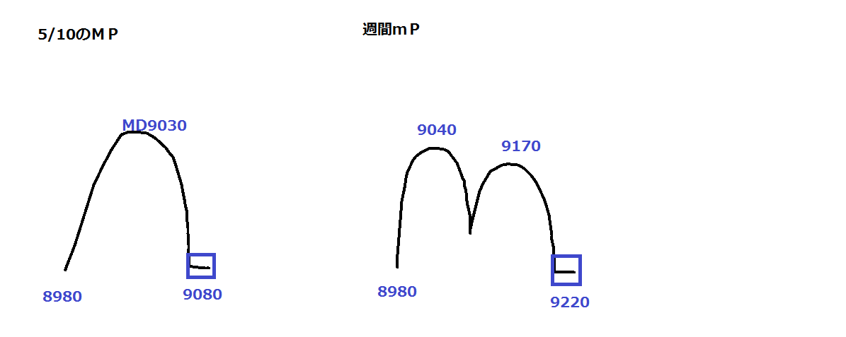 下値めどはN値8840、トレンドライン下限も8850近辺、H&Sターゲット8800 って所でしょうか。