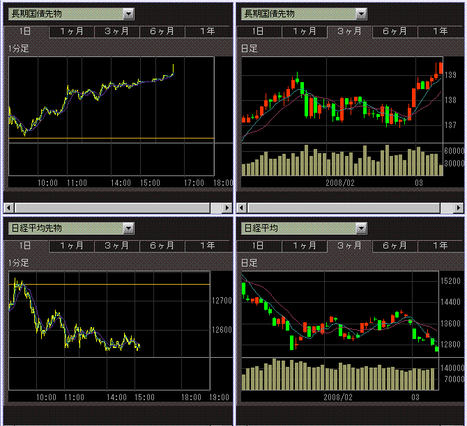 市場予想を大幅に上回る機械受注を受けて、日経平均は寄り付き直後は前日比変わらずくらいまで買われましたが、その後は買いは続かず結局大幅続落で引けました。長期国債先物の動きを見るとペアトレードによる株先物への売り圧力もあったと思いますが、もっときつかったのは現物の売りだと思います。鉄鋼、非鉄、商社、海運、重工、造船あたりの、景気循環株、バリュー系でくくられる銘柄が、めちゃくちゃに売られていました。虎年さん風に言えば、”バリューの崩壊”でしょうか。ABS、RMBS、社債、地方債などの価格が下がっているのでこれを担保にしていたヘッジファンドが担保不足になって株式を投売りしている(去年の8月や11月のように)、もしくは国内機関の期末前の売りだと思われますが、おそらく売らざるを得ないところが売っているのでしょう。アメリカ下がったし不安だからとりあえず売っておくか~という売りではなくて、強制的な売りのように見えました。いつ売りが止むのかわかりませんが、しばらくは上記の銘柄への売り圧力を注視していきたいと思います。