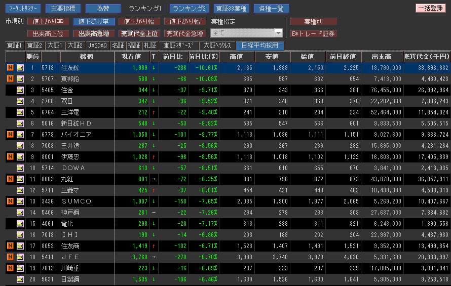 予想を大きく下回る雇用統計を受け大幅安で始まりましたが、FRBによる資金供給を好感し一時はプラスへ。しかし、週末ということもあり、結局大幅続落で終えました。