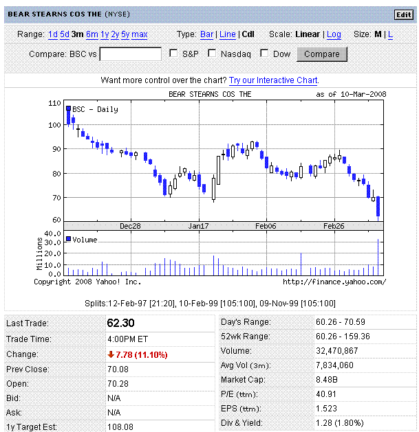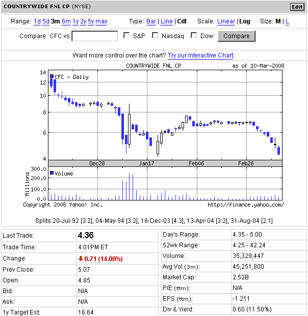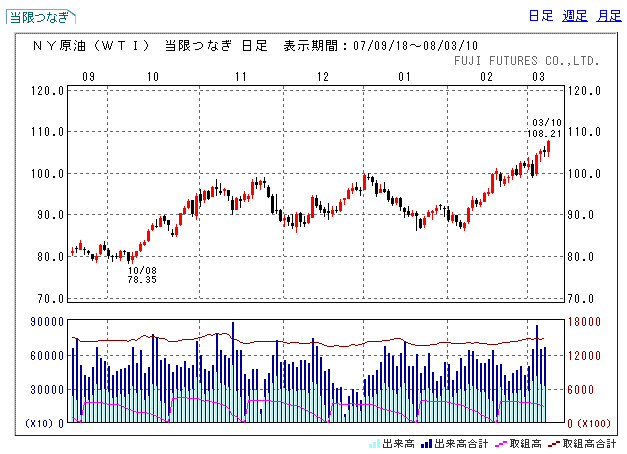 カントリーワイドやベア・スターンズに悪材料が出て金融株が大幅安となり、株価指数も大幅続落となりました。原油は1バレル$200もありうるというGSのレポートや利下げ観測で、原油価格(WTI)が急騰。これも株式市場のおもしとなりました。