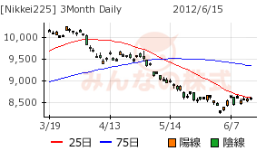 先週は、ギリシャの再選挙前で、世界的に様子見気配が濃厚で、NKも上値の思い展開で、25日移動線が頭を押さえていた。で、週末にはついに25日移動線が8650円を下回った結果、金曜日の高値が25日移動線と交差した。