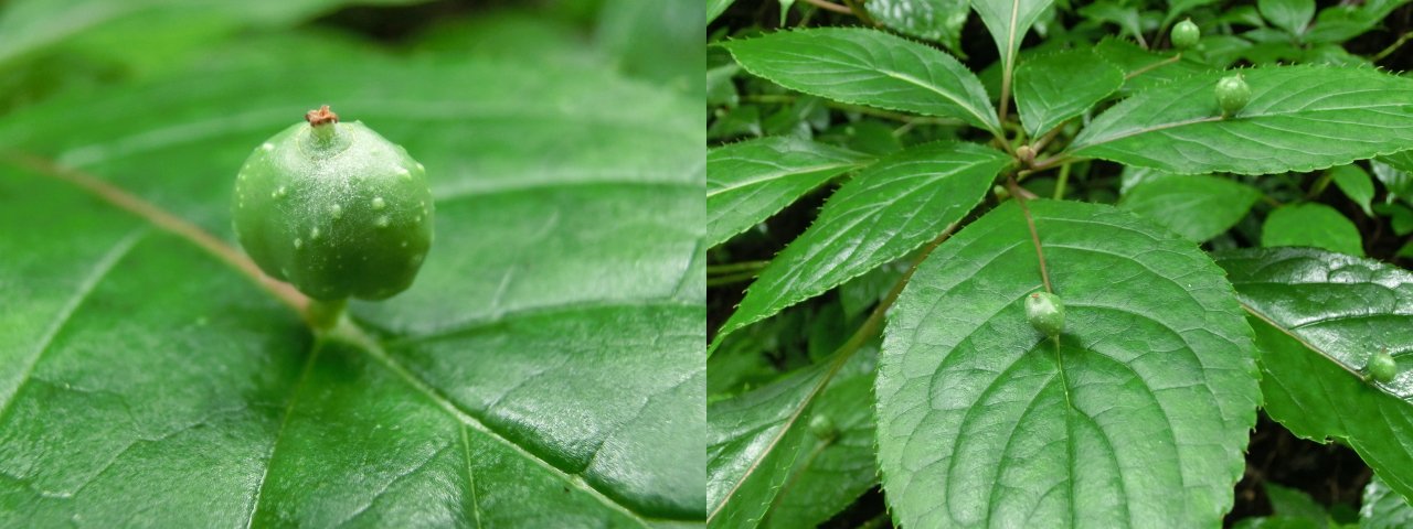 ハナイカダの実が膨らんできれいに1個ずつ葉っぱの真ん中にいます