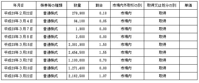 実際買い付け 1000万株 9億8473万7800円 平均 98.47円