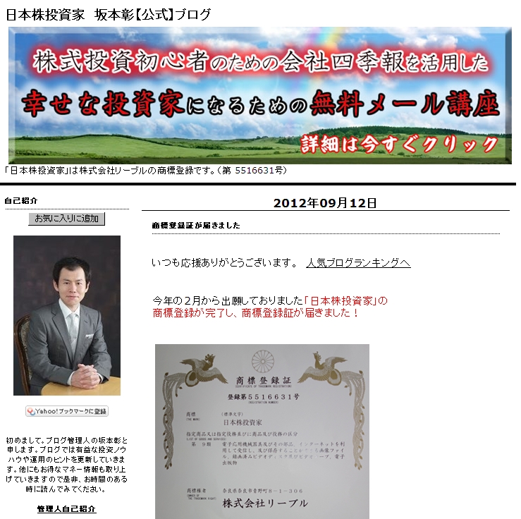 今年の2月から出願しておりました「日本株投資家」の