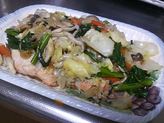 材料は 鮭4切れ 玉ねぎ中1個 人参1本 キャベツ1/3 しめじ1株 えのき1パック
