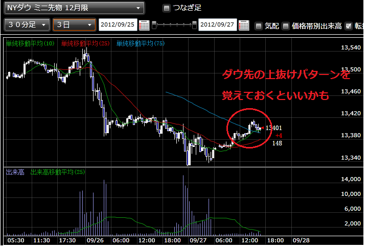 ダウ先のこの形状は上放れパターン(30分足75-25GC)ですので、覚えておくといいと思います。(ただし分足レベルでです)
