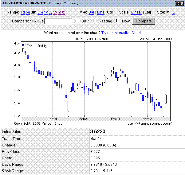 JPモルガンが、ベア・スターンズに対する買収額を1株あたり約10ドルへ引き上げたことを好感しダウは+100ドルくらいでスタート。日本時間で23:00に発表された2月中古住宅販売で販売件数が予想外の前月比プラスになったことから、さらに上伸し、大幅続伸で引けました。長期国債は大幅下落(長期金利は上昇)。質への逃避で買われていた国債から、資金が株式へ戻ってきているようです。他の市場でもCDSのスプレッドが下がってきたりと、過度なリスク回避姿勢が和らいできているようです。