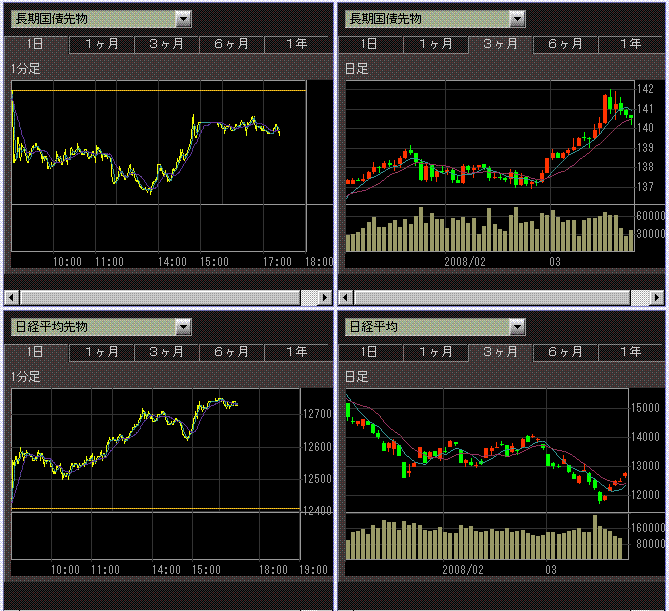 今日は用事があって休みにしたので後場は日経平均とTOPIX先物と225先物のグラフを並べて眺めてましたけど、指数なんかと違って先物のグラフってビヨビヨ動くんで面白かったです^^