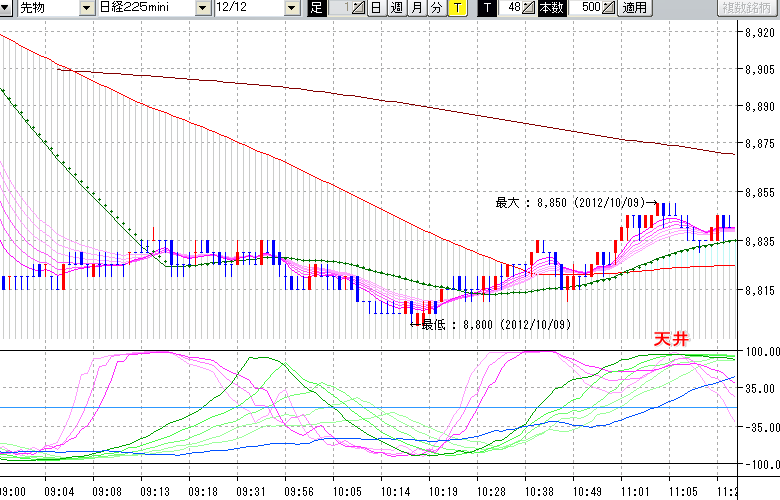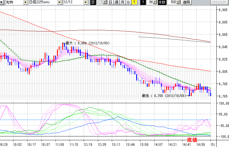 指標ラインの密集点が天底・転換点を示します。指標の見方