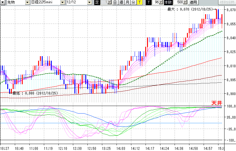 指標ラインの密集点が天底・転換点を示します。指標の見方