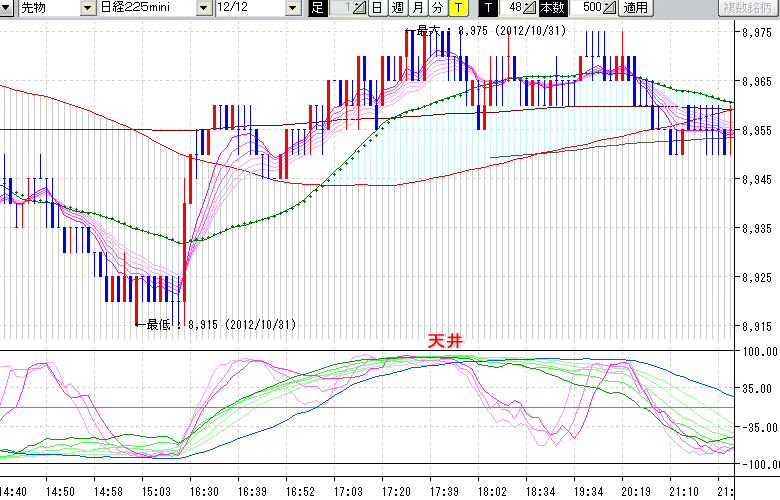 指標ラインの密集点が天底・転換点を示します。指標の見方