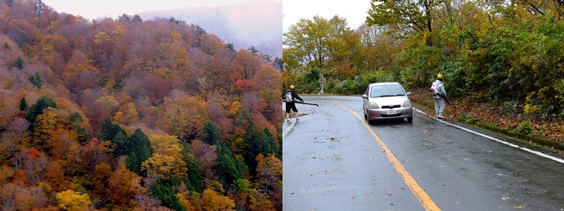 写真右は岐阜県側のかなり降りたところの道でエンジン付き送風機で落ち葉を道路わきに吹き寄せしている作業員さんのようすです^^;