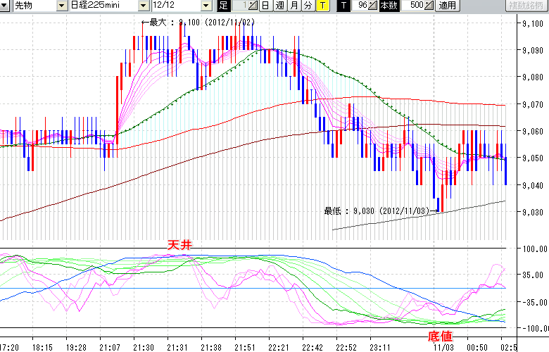 指標ラインの密集点が天底・転換点を示します。指標の見方