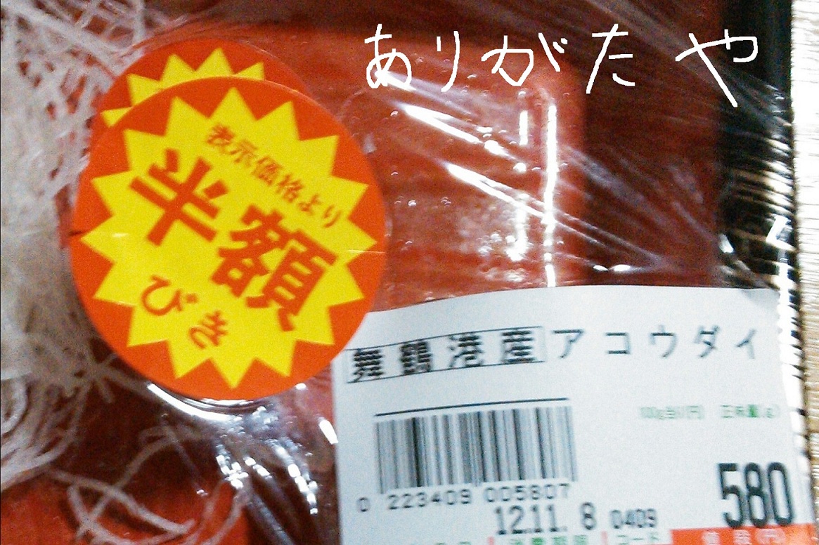 > 閉店間際のスーパーでアコウの刺身を半額の300円にて購入♪