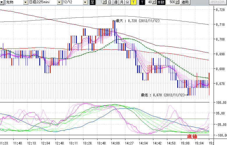 指標ラインの密集点が天底・転換点を示します。指標の見方