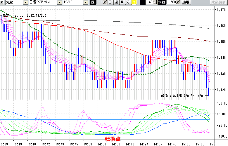 指標ラインの密集点が天底・転換点を示します。指標の見方