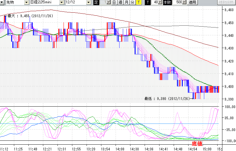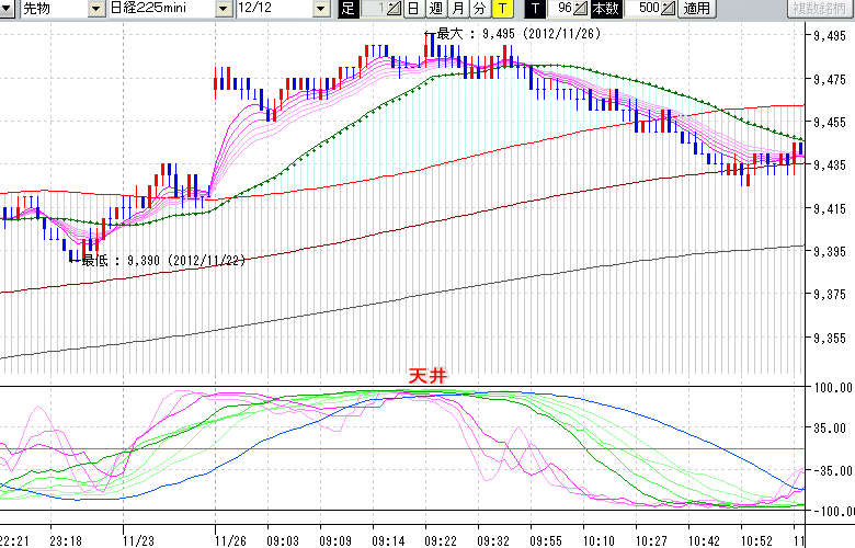 指標ラインの密集点が天底・転換点を示します。指標の見方
