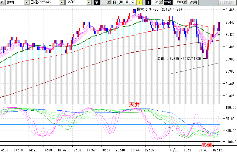 指標ラインの密集点が天底・転換点を示します。指標の見方