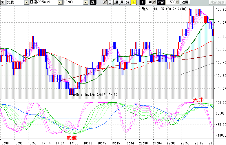 指標ラインの密集点が天底・転換点を示します。指標の見方