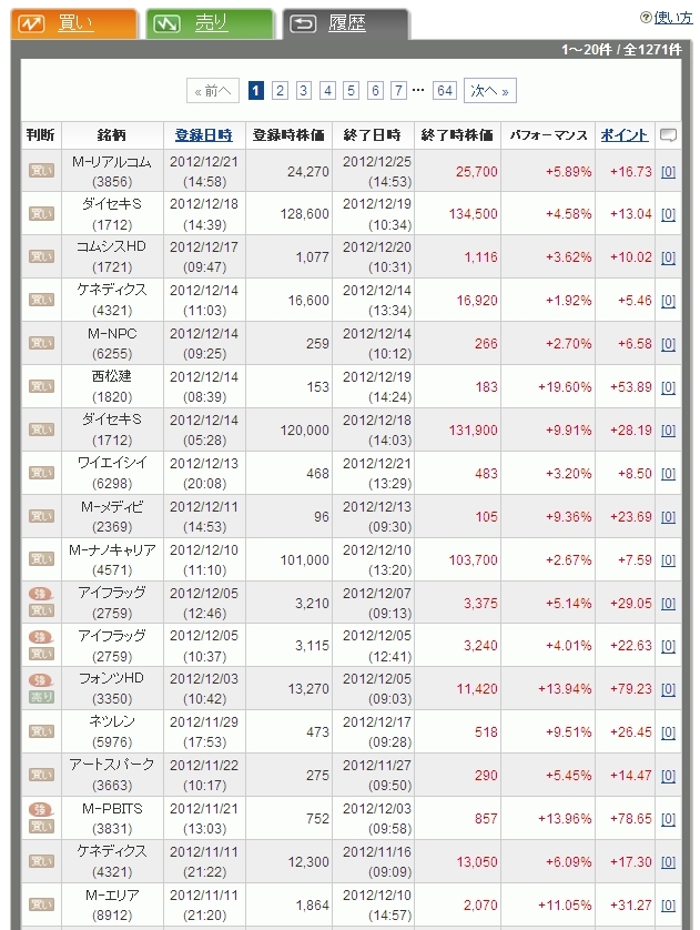 赤いポイントが5ページの最後(今年の2月22日予想のシコーが倒産で大幅マイナスポイントです)で青色に変わってます