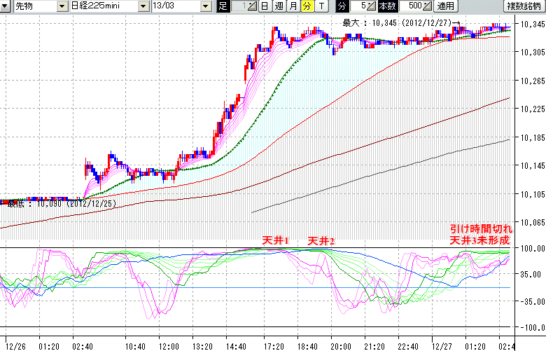 指標ラインの密集点が天底・転換点を示します。指標の見方