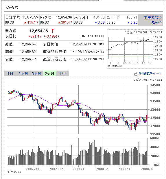 ∇ダウ:12,654.36(+391.47) ナスダック総合指数:2,362.75(+83.65) S&P500:1,370.18(+47.48)