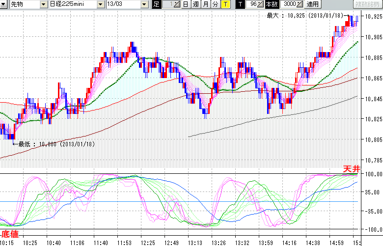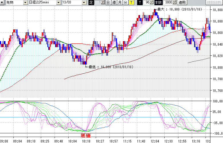 日経225mini先物チャート(下) : 96ティック足