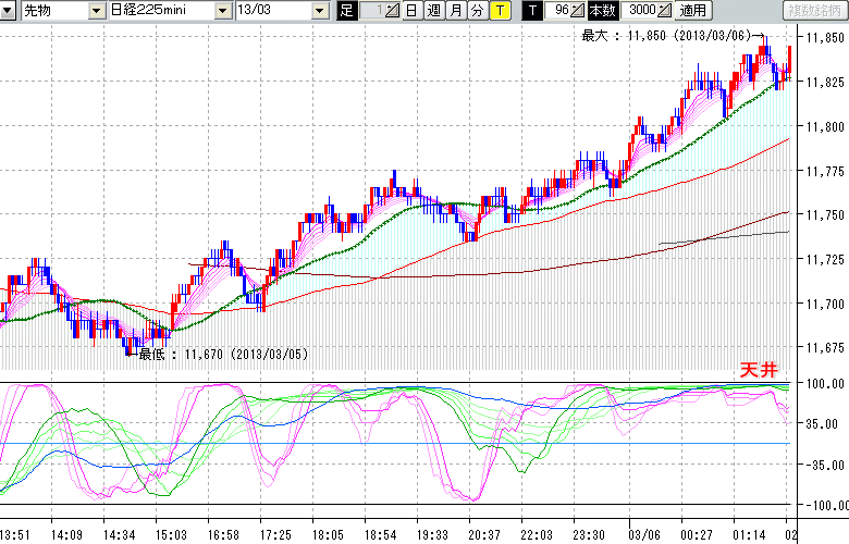 指標ラインの密集点が天底・転換点を示します。指標の見方