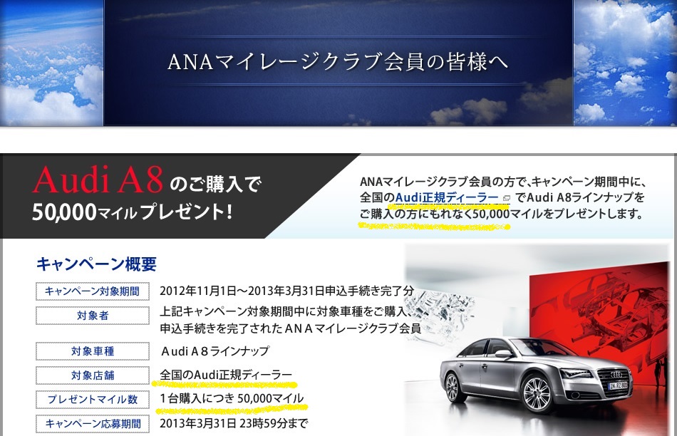 Audiの正規ディーラーで、Audi A8を1台購入につき、もれなく50,000マイルプレゼント!!