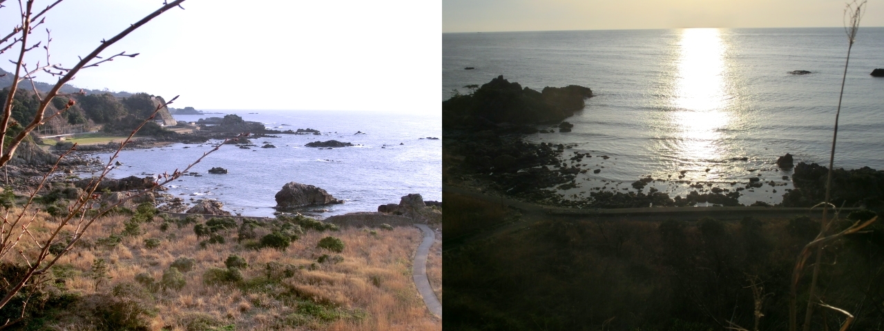 写真は長橋漁港の上の山道から下の海岸の夕焼け間近の風景です