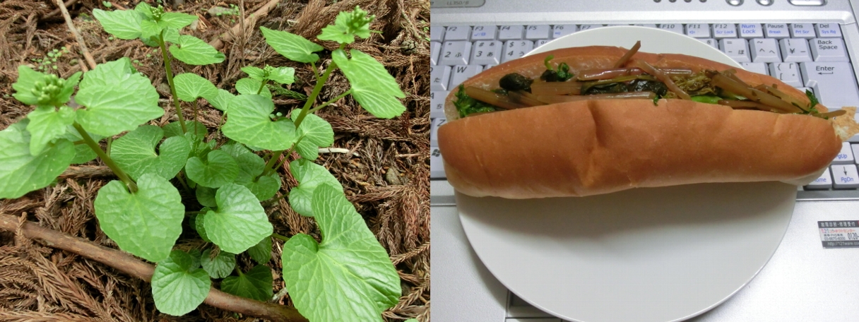 昨日の山歩きでワサビやシャクを採集しましたので、じじいのオヤツは山菜を挟んだホットドッグです