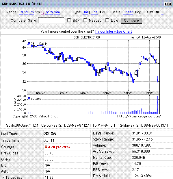 GEの1Q決算が予想外の減益だったことから、先週末の米株は大幅下落しました。金融部門だけではなく、工業部門などもそんなに良くなかったことから、金融市場の混乱+実体経済の減速を象徴するものとマーケット参加者には捉えられたようです。しかしまあ、トヨタの2倍の時価総額の銘柄が10%以上も下がるってすごいですね。GEは一日で、4.7兆円の時価総額減少。