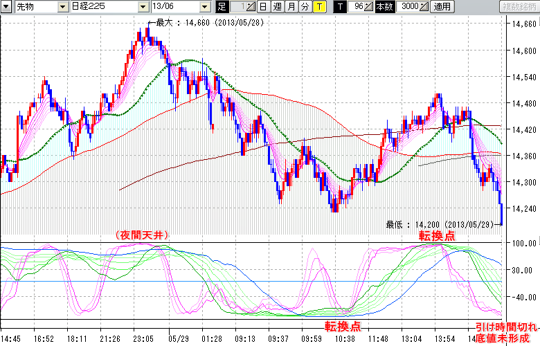指標ラインの密集点が天底・転換点を示します。指標の見方