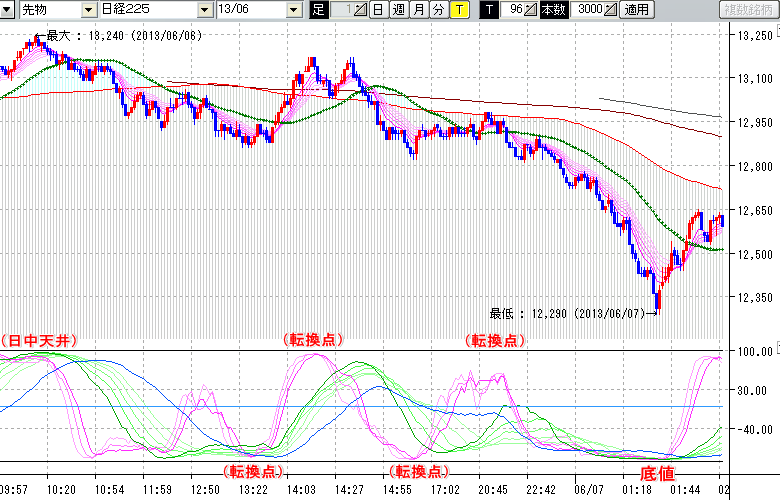 指標ラインの密集点が天底・転換点を示します。指標の見方