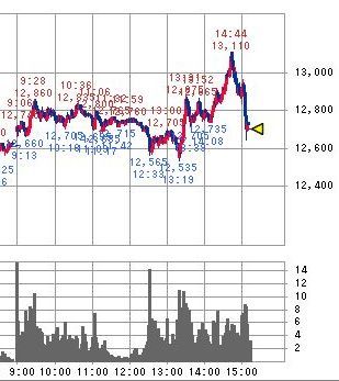 日経平均の終値が前日比で-0.21%の12,877.53(前日比-26.49)で朝の寄り付きでシカゴ日経平均先物の米国市場終値12,700円にさや寄せして始まったことを考えるとそこから200円近いプラスとなり、日経平均で見れば株価防衛は成功したといえそうである。